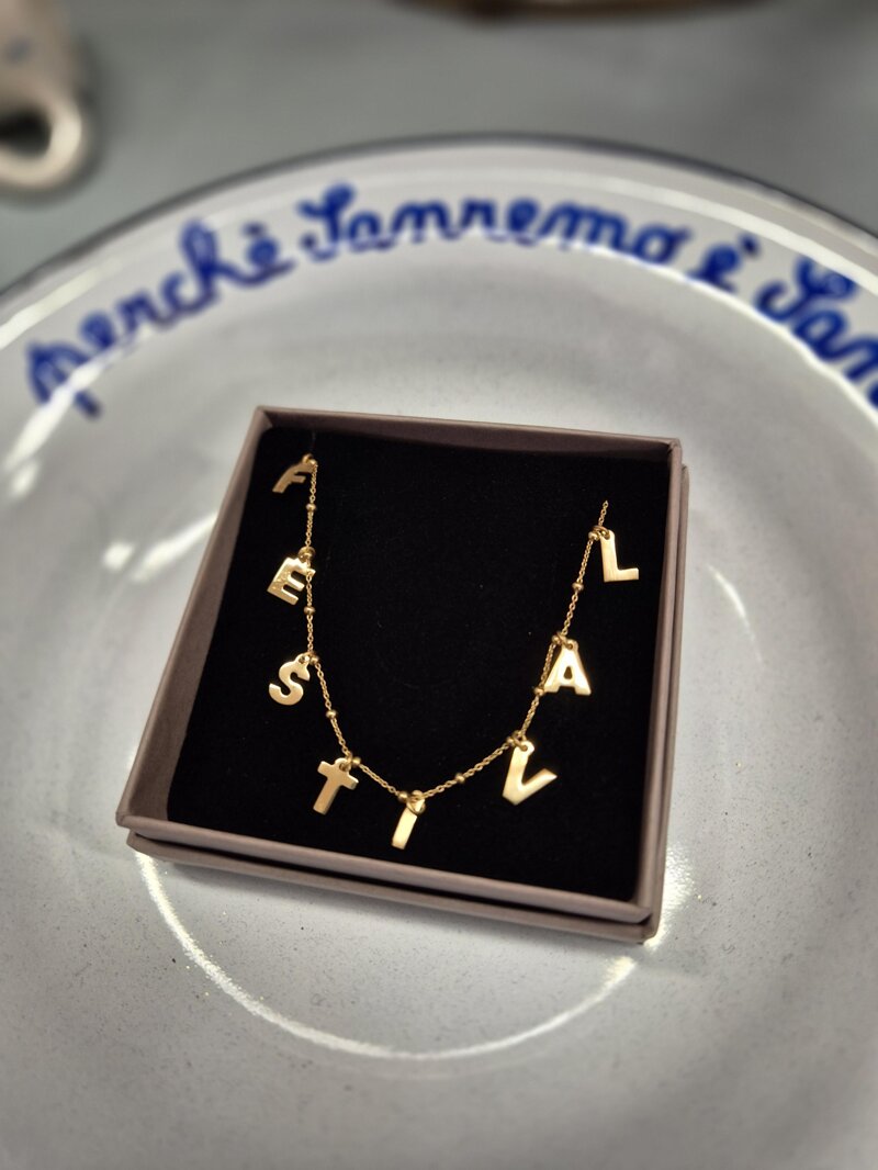 Collane in argento placcato oro di Attimi Preziosi x Hello Darling modello lettering: girocollo con lettere pendenti in argento smaltato oro con la scritta FESTIVAL