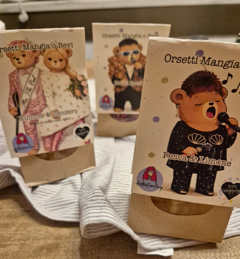 Eccoli, gli orsetti MANGIA O BEVI sono tornati! Orsetti 100% naturali da mangiare come caramelle o sciogliere nell'acqua calda per farne tisane! In 3 gusti, ognuno abbinato ad un iconico outfit di sanremo Frutti rossi per Orso Dargen Pesca e Limone per Orsa Orietta Limone e Zenzero per Orso Rappresentante